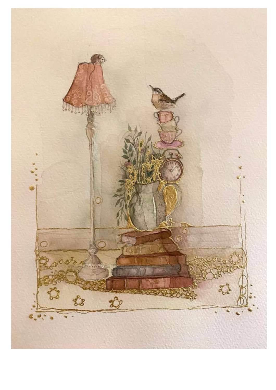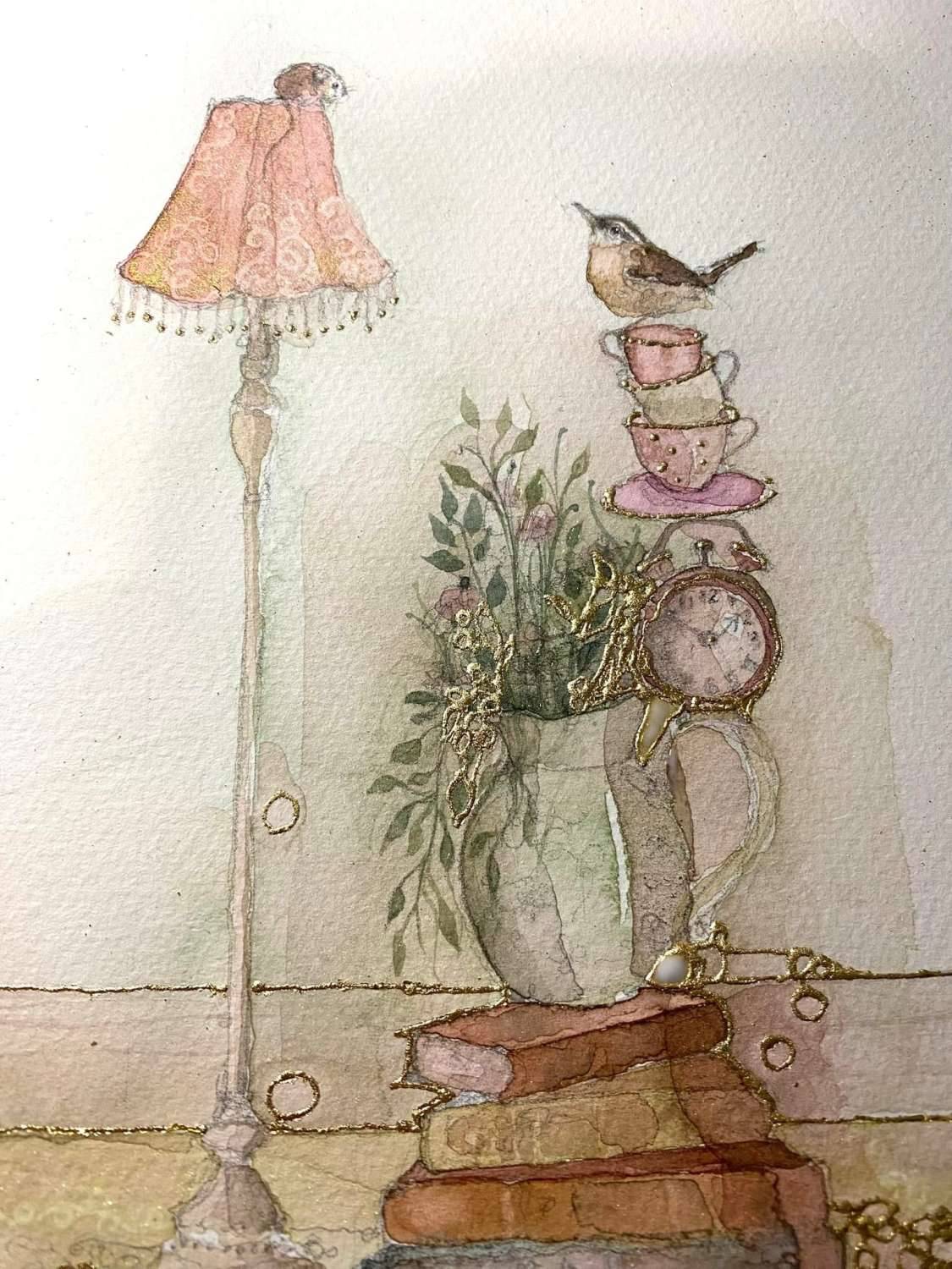 Wee mouse has made her way to the toppermost of Granny Boo’s favourite lamp… little wren wants to meet mouse and so has cleverly made a viewing platform from a pile of books, a flower vase, a clock and some stacked teacups… where there’s a will, there’s a way ?