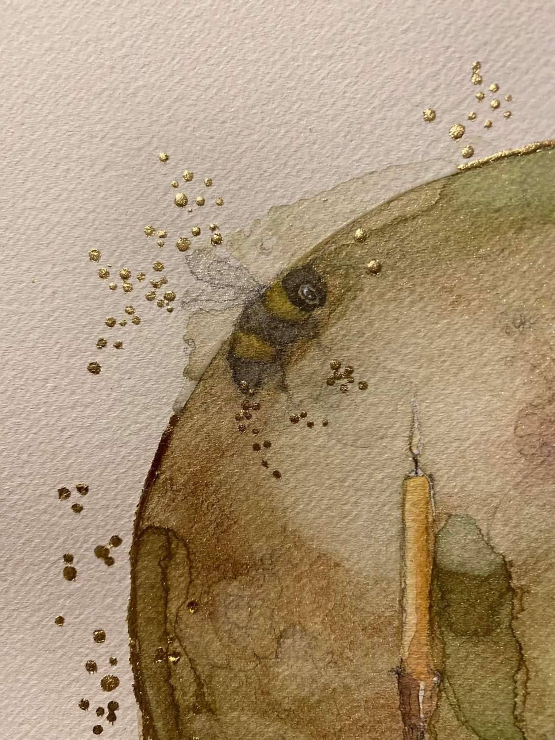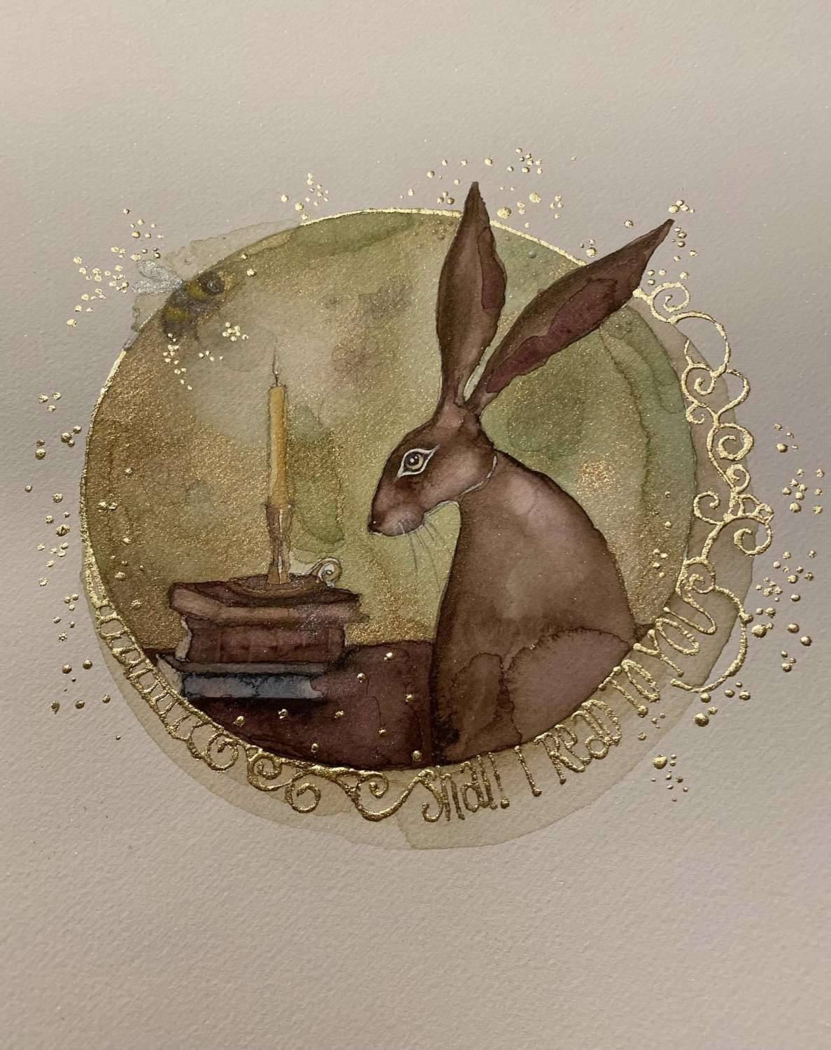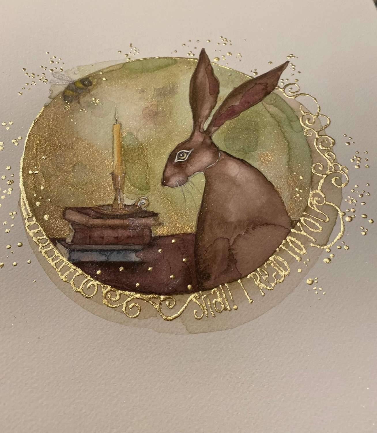 This delightful artwork has handsome hare beside his treasured book collection. Candle lit and about to choose a story to enjoy, hare spies a wee worried bee up in the dark corner of the room… “shall I read to you”? he asks …how kind…wee bee will be calmed in no time.