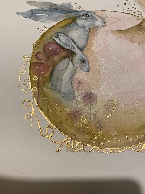 I have applied gold leaf detailing which compliments the slight iridescent paints used to give a magical sheen in appropriate places.