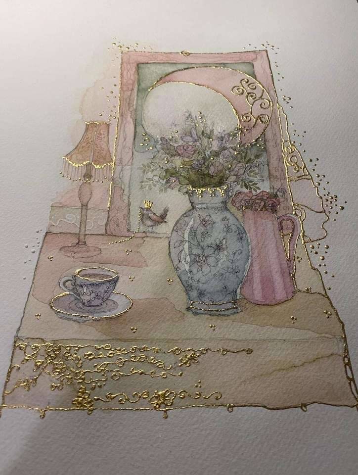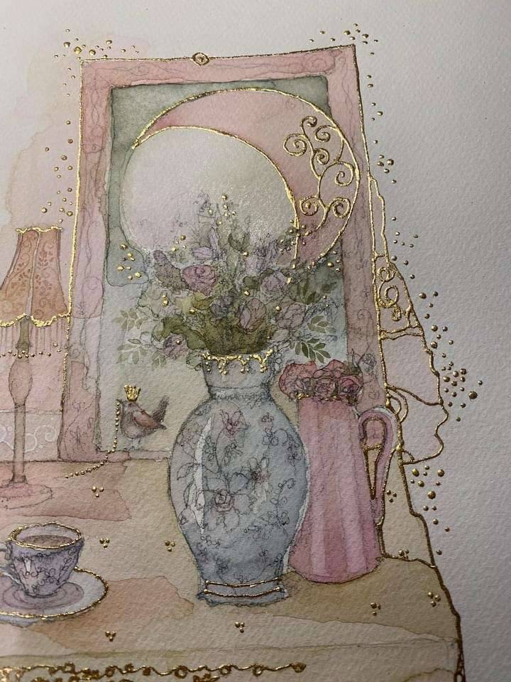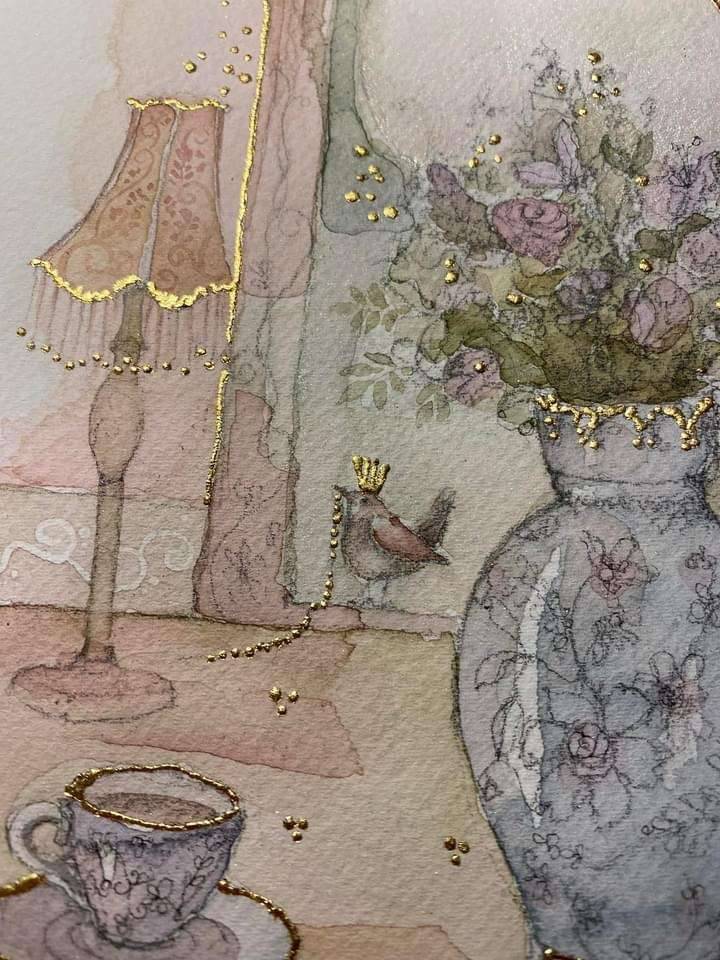 An original watercolour painting measuring 9” x 12” in size. Painted on 100% cotton 300gsm watercolour paper, this beautiful work is finished with gold leaf.